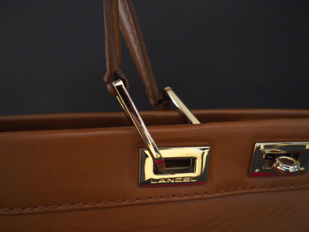 LANCEL, Paris Sac à mains Balancel en cuir lisse de couleur camel. Grande poche zippée à l'avant. Intérieur à deux compartiments et une poche zippée. Deux poches latérales de taille différents et une poche plaquée à zip. Garniture dorée. Un cadenas et une clé. Deux anses. 28 x 36 x 11 cm Dans son pochon. (petites usures)