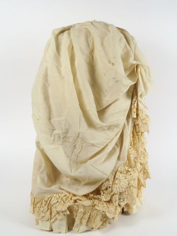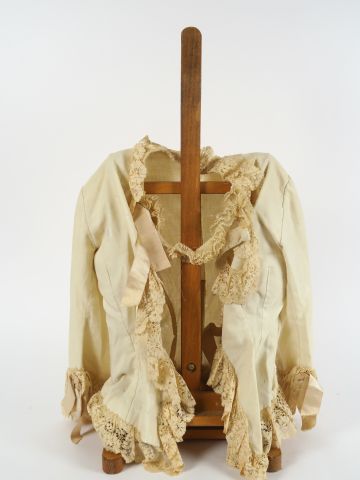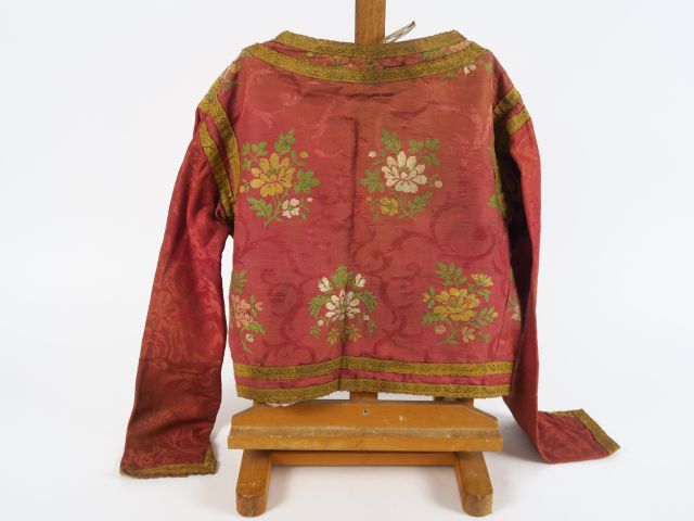 Lot comprenant une robe de femme en deux parties, jupe et haut griffés madame Brais Alain 22 rue Grégoire fin du XIXème, grosse dentelle mécanique en bordure, pouf sur les fesses. On joint une veste de comédie en partie XVIIIème siècle dans le gout turc, une jupe montée à plis canons première partie du XIXème, soie changeante rayée or et brun petite largeur deux poches plaquées à l'avant.
