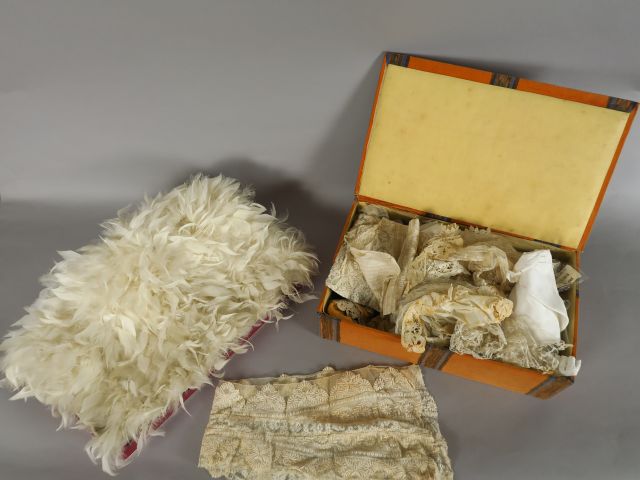Lot de diverses dentelles dans une jolie boite. On y joint un dessus de coussin en plume de cygnes