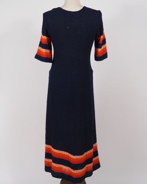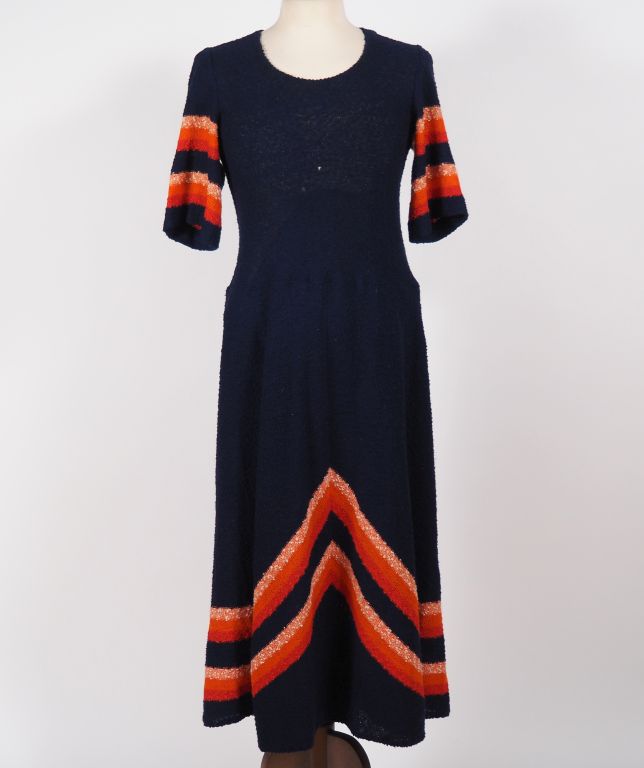 Louis FERAUD, Paris Robe longue à manches courtes en maille bleu, à décor de motifs dans les tons rouge et orange. Taille présumée : 42 (étiquette indiquant la composition et la taille manquante) (trous dans la maille)