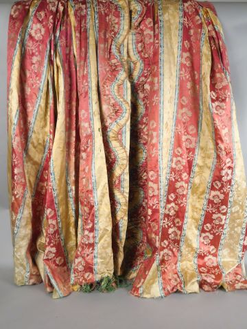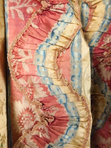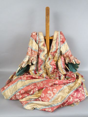 Manteau d’une robe à la française, époque Louis XVI, manches sabots à deux rangées de volants, falbalas sur le parement de devant , soie façonnée, à rayures roses bleues et jaunes décor Louis XVI de grosses fleurs monochromes. Doublure totalement dégradée et manquante par endroit. Quelques trous. Quelques déchirures manques, soie fusée par endroit ourlet déchiré (7)
