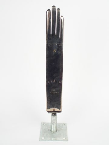 Objet de métier : gantier. Main chauffante électrique qui servait à mettre en forme les gants en fin de fabrication. Métal chromé gravé du nom du gantier H C Grenoble