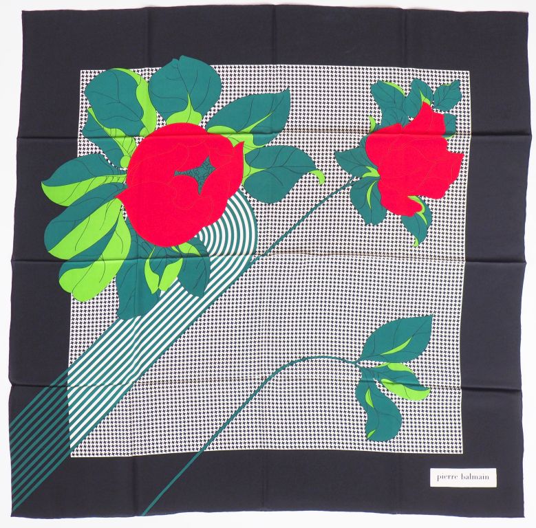 Pierre BALMAIN Foulard en soie polychrome, à décor de roses rouges sur fond noir et blanc. Large bordure noire. Signé. On y joint un petit foulard de poche Christian Dior, modèle "Poison" en polyester. Signé.
