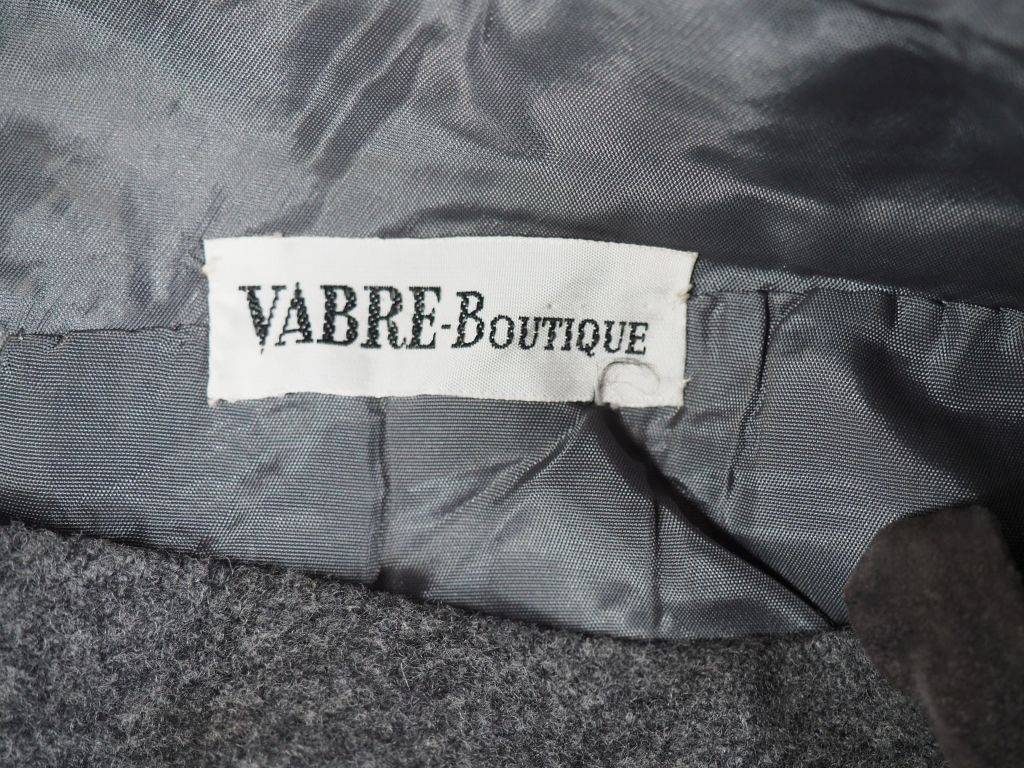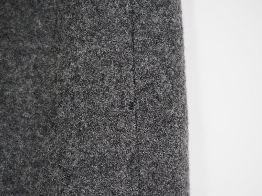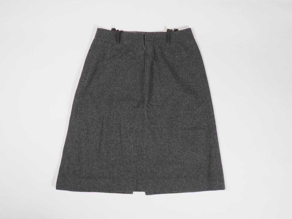 Pierre CARDIN, Paris Jupe taille haute probablement en laine grise. Fendue à l'avant. Deux fausses poches plaquées. Fermeture par zip à l'arrière. Taille présumée : 42 (étiquette indiquant la taille et la composition manquante, usures, petits trous)