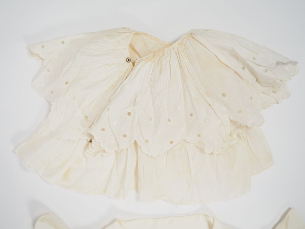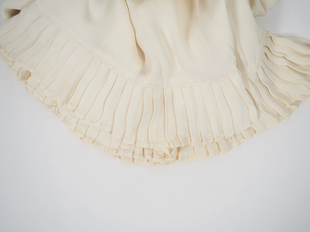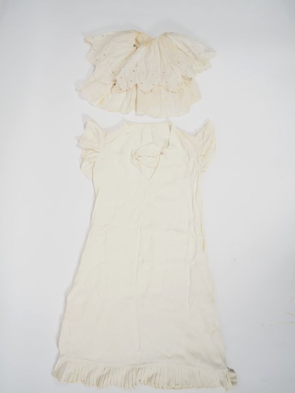 Robe de jeune fille années 1930, soie synthetique, effet de plissé sur l'ourlet bon état d'usage. On joint un col. Expert : Véronique Dumont Castagné
