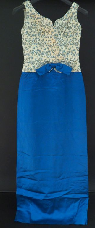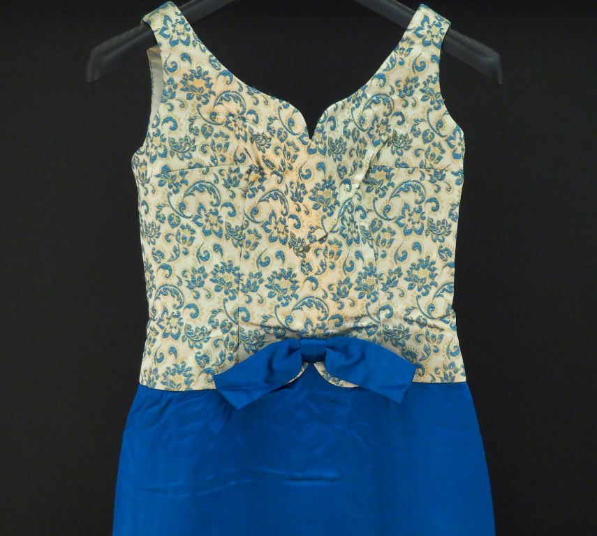 Robe de soirée sans manche probablement en soie ou satin. Le haut de la robe à motifs de rinceaux bleu rehaussé d'or sur fond crème et agrémenté d'un nœud de la même couleur que le bas de la robe. Pas d'étiquette, ni de taille apparente. Doit correspondre à un 38.