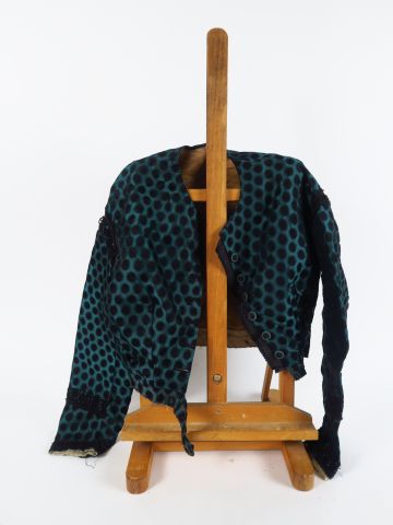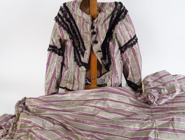 Robe XIXème en soie à rayures parme vertes et blanches en trois pièces (usures), corsage XIXème siècle en soie à rayures bleues et blanches, très jolis boutons en velours épinglé doublure en coton glacé (bon état general) et haut de robe milieu du XIXème en soie à pois noirs imitant le chiné à la branche une manche un peu légère décoloration sous les bras decousus