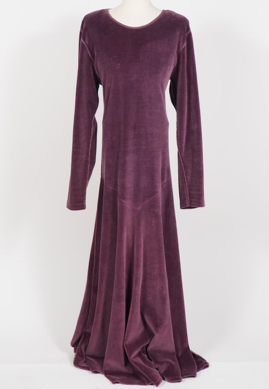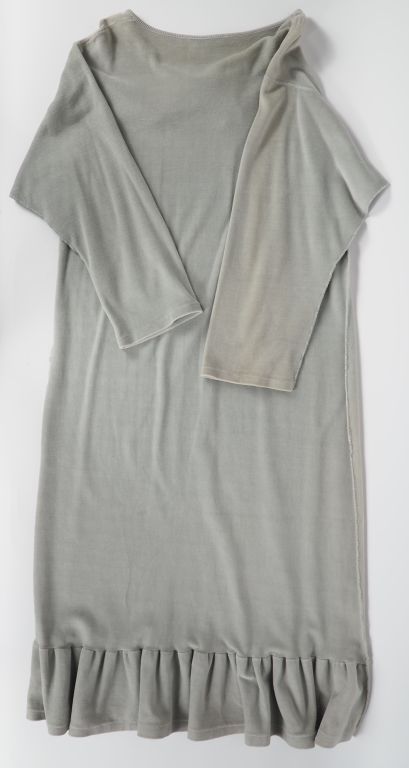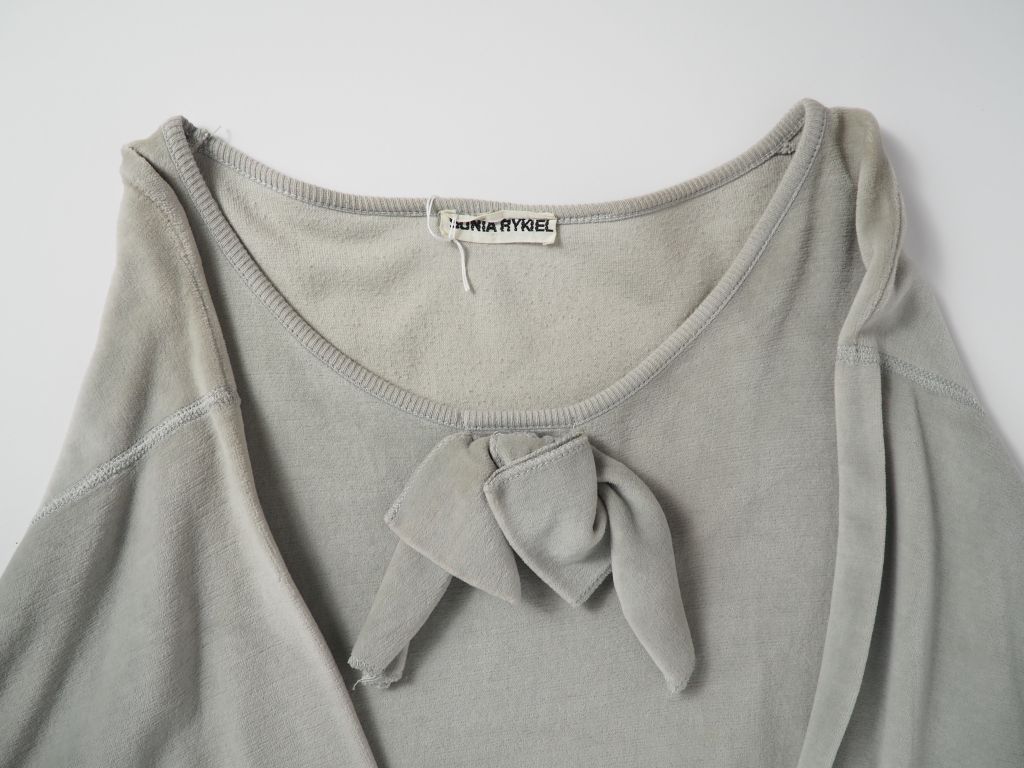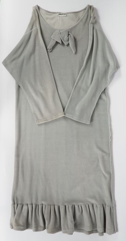 Sonia RYKIEL, Paris Ensemble comprenant : - une robe en coton (90%) et nylon (10%) de couleur prune. Manches longues. Taille. 3 - une robe longue probalement principalement en coton de couleur gris clair, à décor de nœud et de volant sur le bas. Taille présumée. 3 (état d'usage, manque l'étiquette indiquand la composition et la taille)