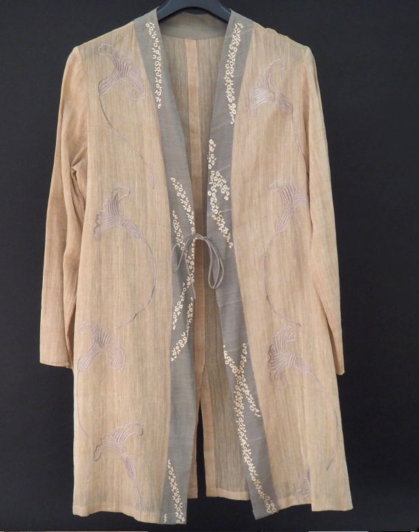 Sortie de bain ou tunique beige en soie (?), à décor de fleurs. Encolure de couleur bleue. Fermeture à l'avant par un lien. Taille. probablement : 36 (sans marque, ni taille apparentes)