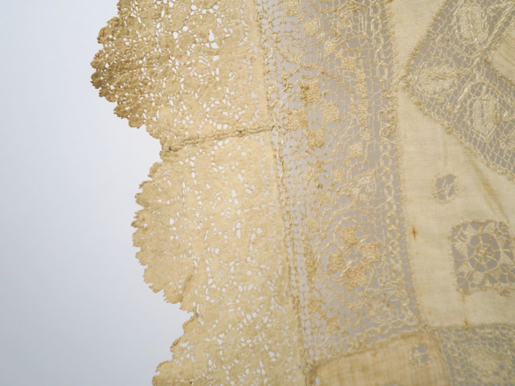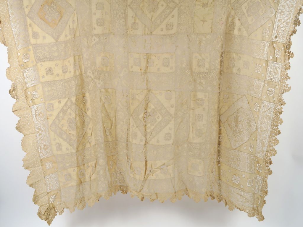 Très belle et rare nappe ou courtepointe, lin tissé main, XVIIème siècle. 150 m de hauteur x 1,08 m de large. La bordure de 7 cm sur 2 des côtés et de 4 cm sur les deux autres sont non comprise dans les dimensions. Ouvrage à damier composé d’une succession de carrés, de rectangles, de losanges exécutés à part et assemblés entre eux. Ils sont travaillés en filet brodé, ou encore en toile incrustée de motifs en point coupés. La bordure est réalisée aux fuseaux dont la forme aux dents arrondies est très caractéristique de la période Louis XIII, au point de la nommer « dentelle Van Dyck ». Le décor et les volants des bordures ne sont pas symétriques, ce qui laisse supposer des remaniements possibles. Restaurations, petites taches, petits trous, quelques brides lâchées Très belle et rare pièce de collection cependant. Expert : Véronique Dumont Castagné