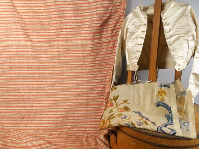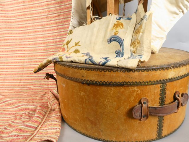 Très jolie boite à chapeau en bois. Très bon état. On y joint un haut en satin blanc, un petit metrage de cotonnade rayée et un dessus de coussin en toile imprimée