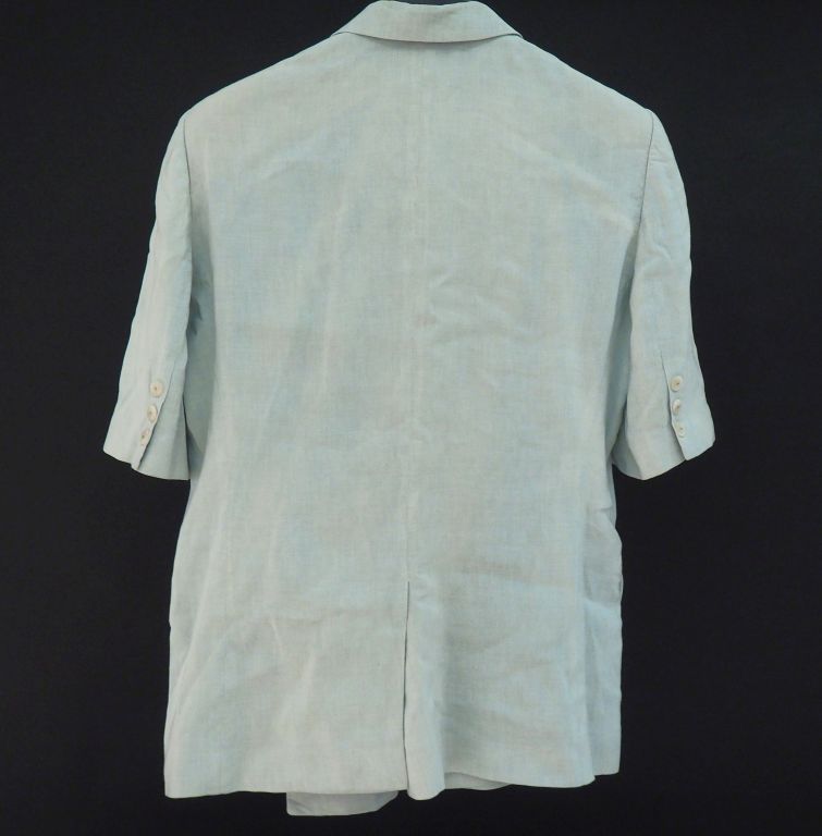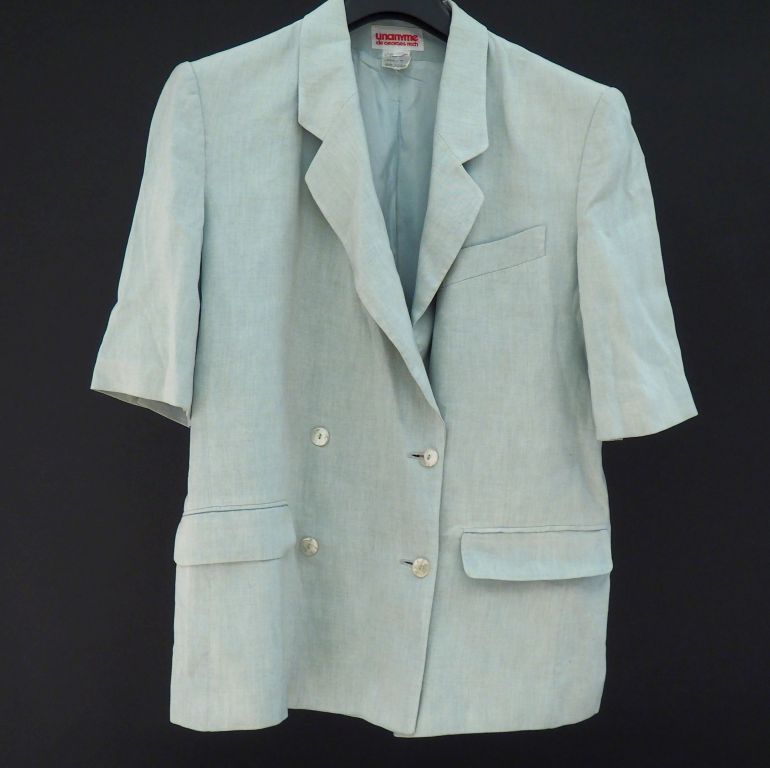 UNANYLE, de Georges RECH Veste croisée à manches courtes en lin (45%) et viscose (55%) de culeur vert d'eau. Deux poches à rabat et une poche plaquée à l'avant. Les manches agrémentées d'une ligne de trois petits boutons. Taille. 42
