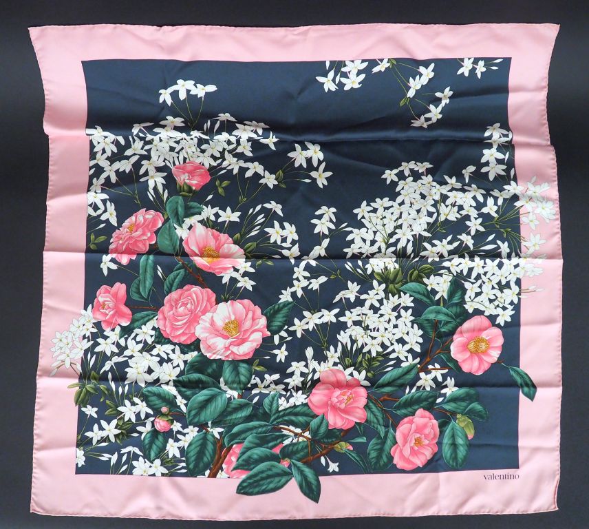 VALENTINO. Foulard à décor de pivoines et de jasmin. Dim. 86 x 86 cm
