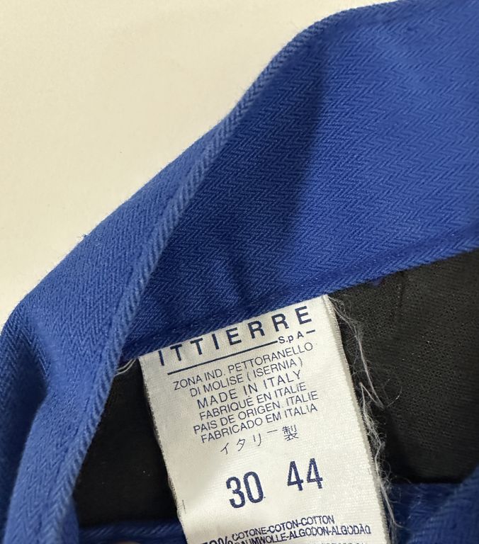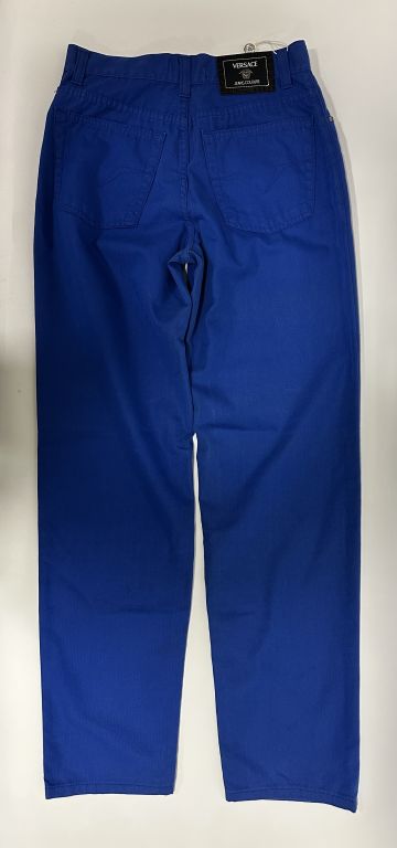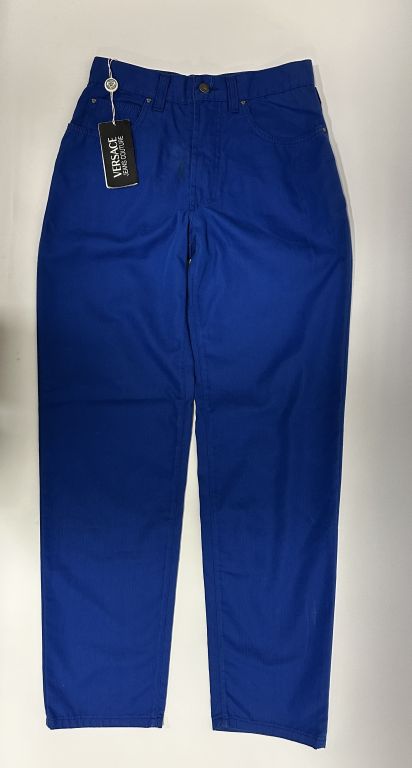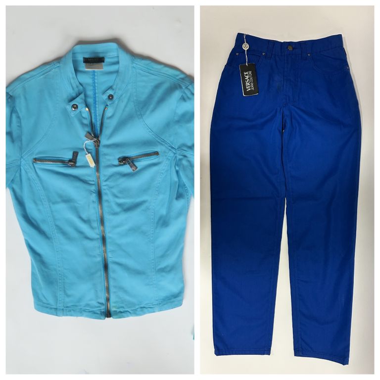 VERSACE Veste en coton (98%) de couleur turquoise. Fermeture à l'avant par zip. Bouton pression au niveau du col. Deux poches à zip à l'avant. Taille. M (état d'usage) On y joint un pantalon bleu en coton (70%) et polyamide (30%). (tâché)