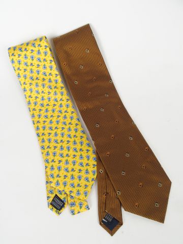 Lot de YVES SAINT LAURENT. Deux cravates en soie l'une à dominante jaune, l'a au prix de 80 à 120 € en vente aux enchères par l'hôtel des ventes Primardeco