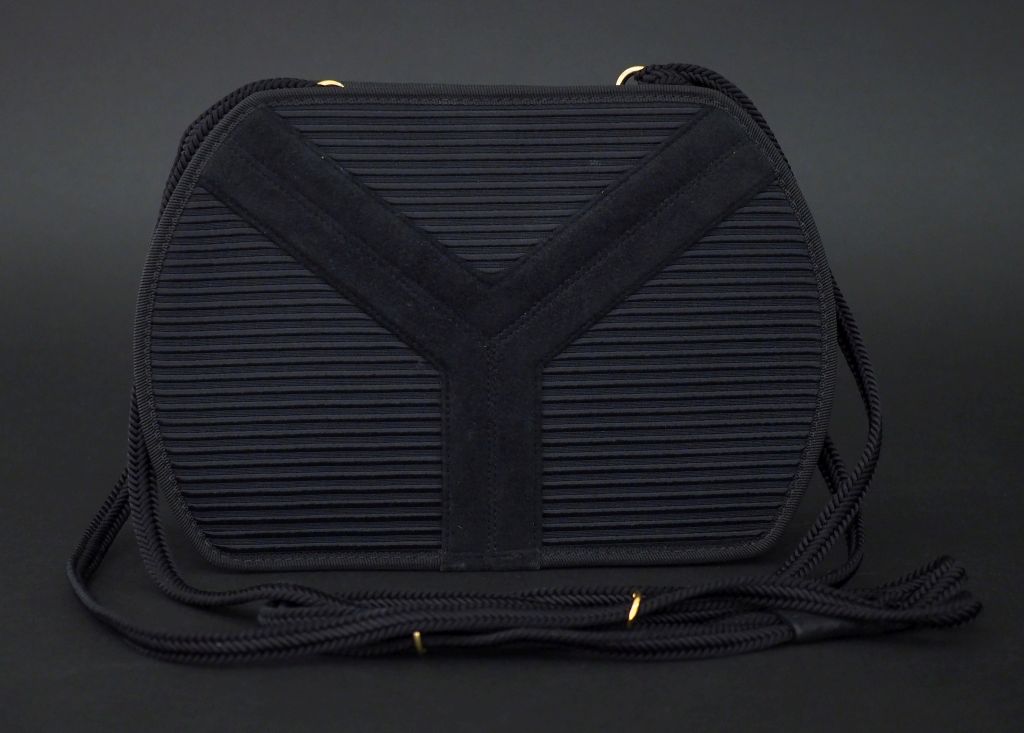 YVES SAINT LAURENT, Paris Petit sac du soir en tissu et velours noir, à décor à l'avant d'un "Y" Fermeture à pression. Pochette intérieur à zip. Signé. 15,3 x 22 cm